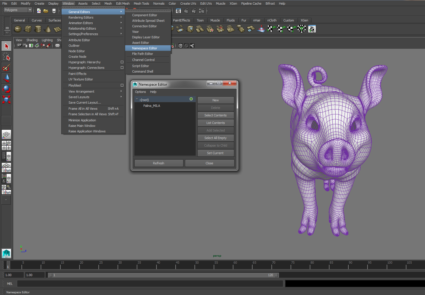 1. Windows > General Editors> Name Space Editor : The Name space editor will pop up on your screen. Any imported assets with name spaces will appear in the little list on the left.